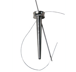 - Unique grasping channel with large spring jaw provides efficient suture retrieval